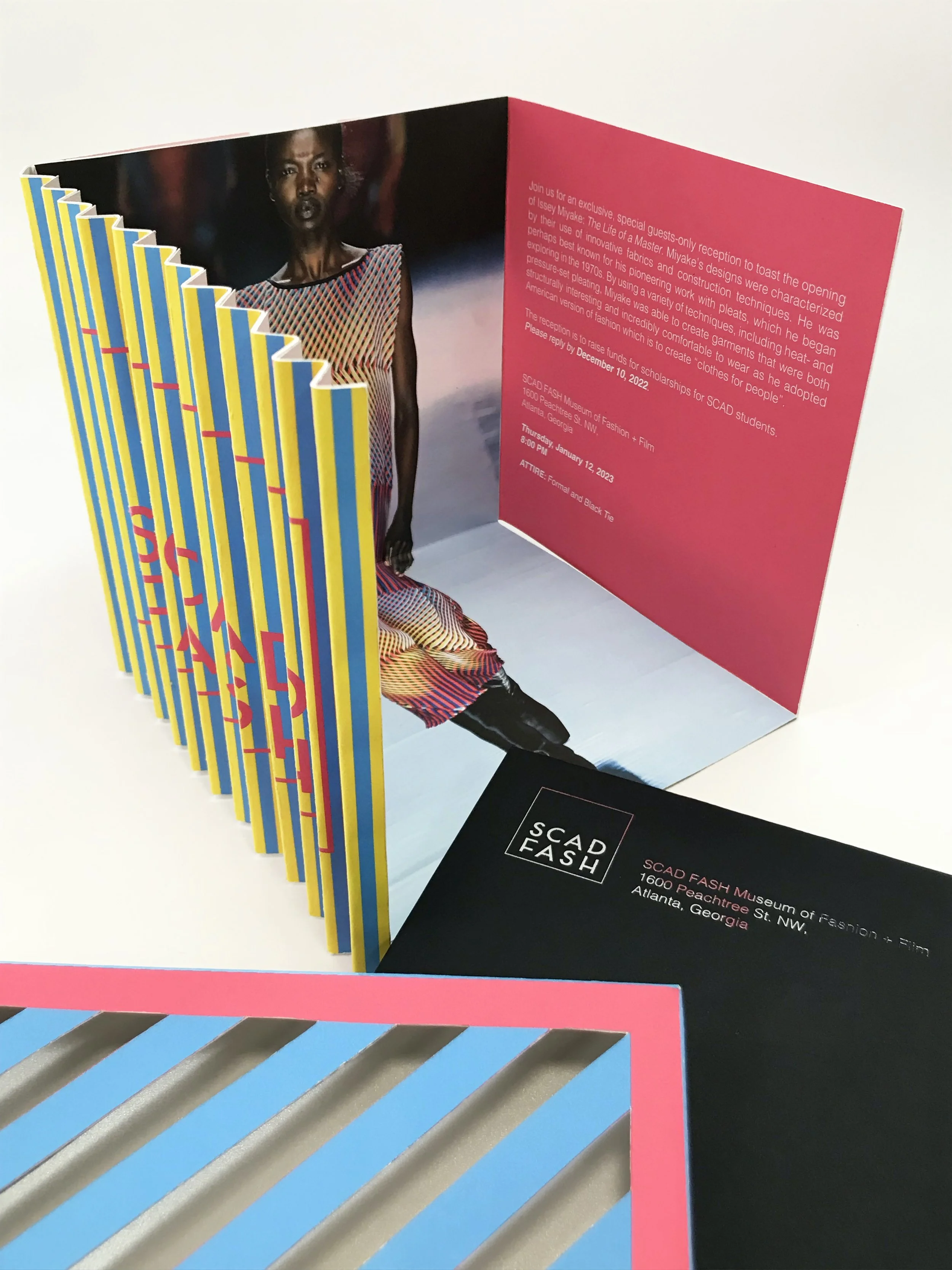 My concept was to pull inspiration from both the brand itself and the dress I have chosen. I decided to create an optical illusion with the invitation by using lenticular print. To achieve this illusion, two images are cut into small stripes, then the stripes are places side by side order. Once the images are layed down and folded, the images would only show up under certain angles.