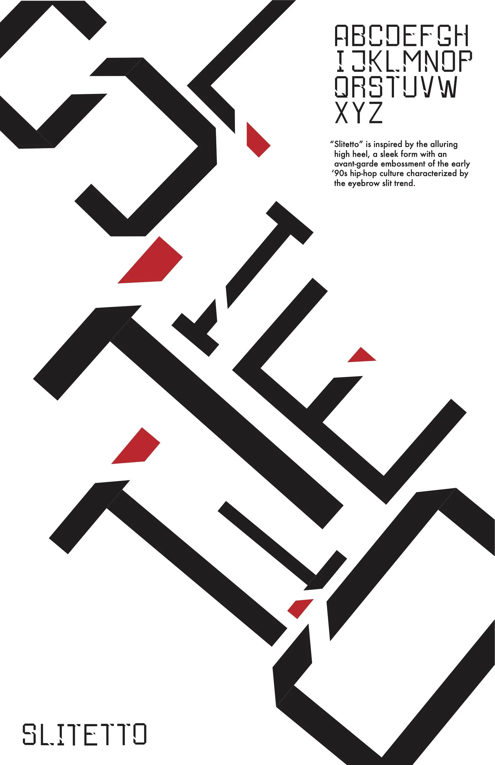 “Slitetto” is inspired by the alluring high heel, a sleek form with an avant-garde embossment of the early ‘90s hip-hop culture characterized by the eyebrow slit trend.